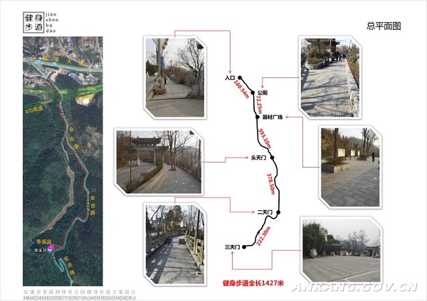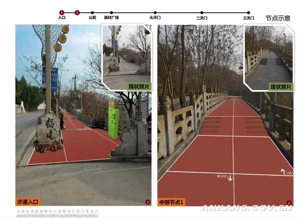 項目實施地點為安康市香溪洞風景區(qū)原有健身步道(水泥路面),北起香溪文化廣場南側(cè),南至香溪洞景區(qū)停車場,全長約1.5公里,寬度介于2.47—3.72米之間。