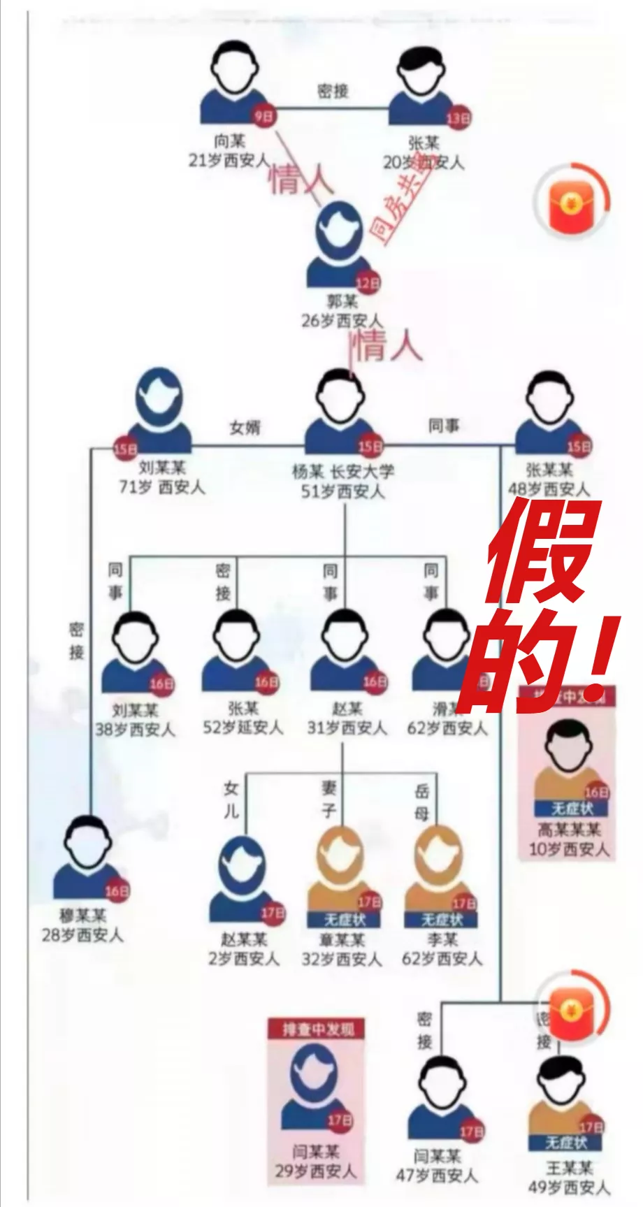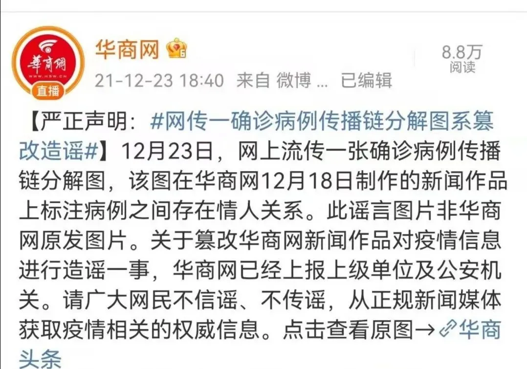 網(wǎng)上流傳一張確認病例傳播鏈分解圖,在病例之間標注“情人”關(guān)系,并傳言此次疫情傳播因素之一,是因為西安首例病例與子牛門診的護士為情人關(guān)系,導致疫情擴散,經(jīng)核實,該圖盜用華商網(wǎng)12月18日制作的新聞作品圖片。該信息為虛假信息,造謠的人已被拘留。