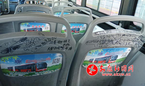 7月7日,筆者乘坐安康市城區(qū)7路公交車發(fā)現(xiàn),公交座椅靠背慘遭“涂鴉”,內(nèi)容不乏廣告標(biāo)語(yǔ)、低俗粗鄙、不堪入目的語(yǔ)言,嚴(yán)重影響乘車心情。希望廣大乘客文明乘車,還市民一個(gè)干凈整潔的乘車環(huán)境。(通訊員 成忠旭)