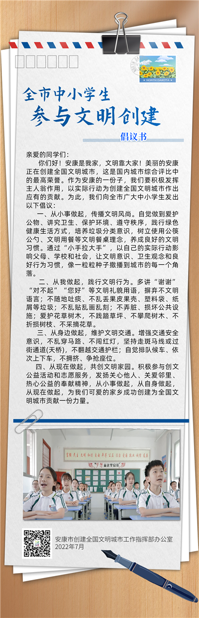 你們好!安康是我家,文明靠大家!美麗的安康正在創(chuàng)建全國(guó)文明城市,這是國(guó)內(nèi)城市綜合評(píng)比中的最高榮譽(yù)。作為安康的一份子,我們要積極發(fā)揮主人翁作用,以實(shí)際行動(dòng)為創(chuàng)建全國(guó)文明城市作出應(yīng)有的貢獻(xiàn)。為此,我們向全市廣大中小學(xué)生發(fā)出以下倡議: