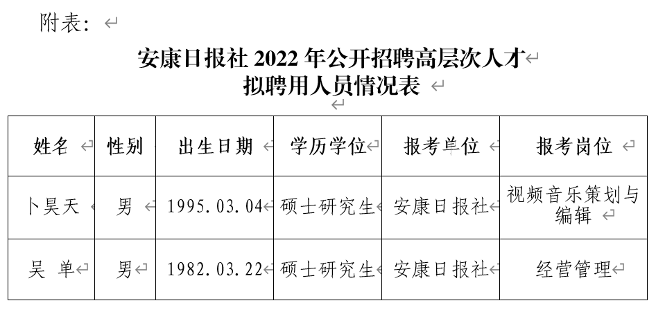 安康日報社2022年公開招聘高層次人才擬聘用人員公示