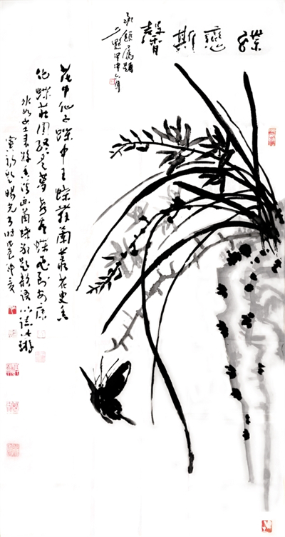 1988年,中國畫壇號稱“蝶王”的王冰如女士,以80歲高齡回到她曾工作生活10年之久的第二故鄉(xiāng)安康舉辦畫展,并且以詩書畫會友,特邀旸光先生和金州著名詩人劉寅初老人同游香溪,冰如老師興之所至,巧繪墨蝶,說道“人言寅初老弟有曹子健七步成詩之才,今日以十步為限,將此畫為題,賦詩一首,旸光老弟書于其上如何?”寅初老只走了三步便道有了,于是順口吟誦,旸光先生揮毫急就“花中仙子蝶中王,蝶舞籣叢花更香,化蝶莊周終是夢,喜看蝶王飛安康。”一筆流暢的行草躍然于畫上,相輔相成,真是詩情畫意天作之合。一幅難遇難得難覓的“三絕圖”誕生了。冰如老師感慨萬千,說到“二位弟臺才高八斗,只可惜待在安康這個(gè)貧瘠的地方被埋沒了也!”這個(gè)場面是一種巧合,正是旸光先生“萬事隨緣”的結(jié)晶,爾后經(jīng)書壇大家陳少默先生為之題跋做款,更是錦上添花,成了四絕圖。冰如、少默、旸光、寅初先生已然作古,這段翰墨丹青之情,將永存世間傳為藝術(shù)佳話。