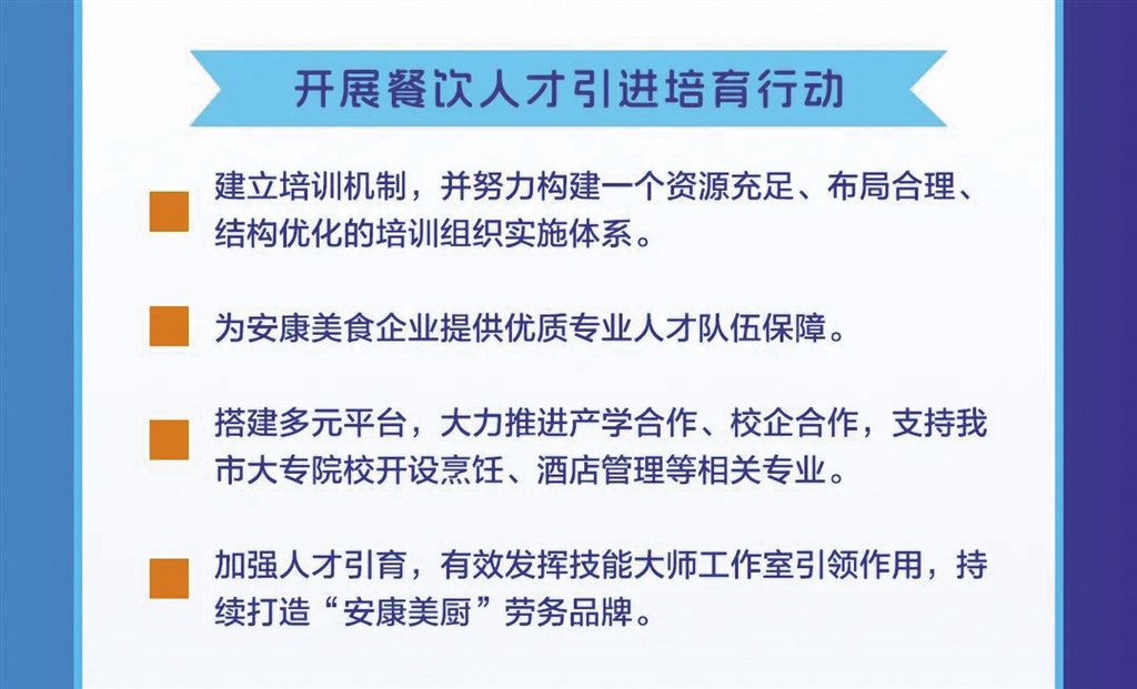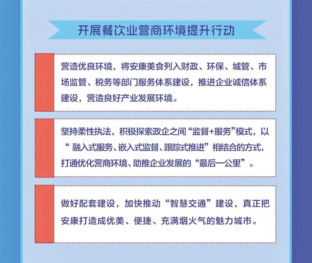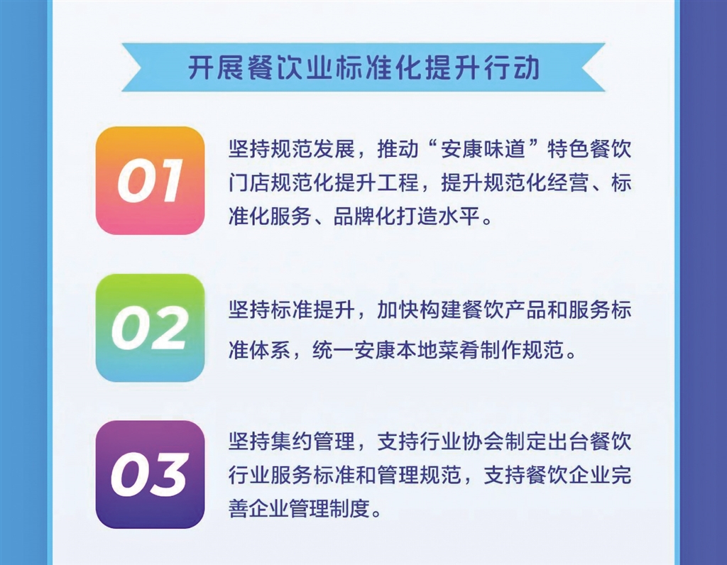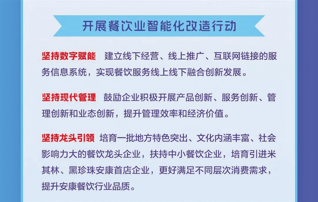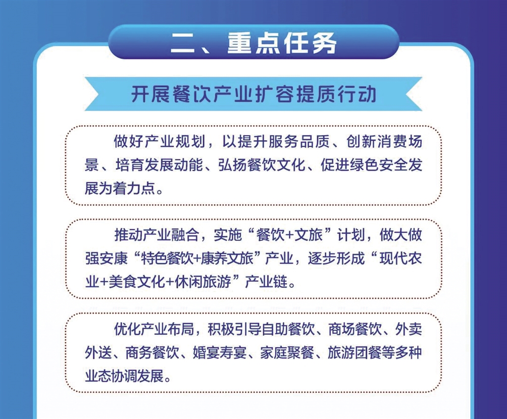 日前,安康市商務(wù)局等11部門(mén)聯(lián)合發(fā)布《關(guān)于進(jìn)一步推進(jìn)全市餐飲業(yè)高質(zhì)量發(fā)展的實(shí)施意見(jiàn)》,本期帶您一圖讀懂其重點(diǎn)任務(wù)。