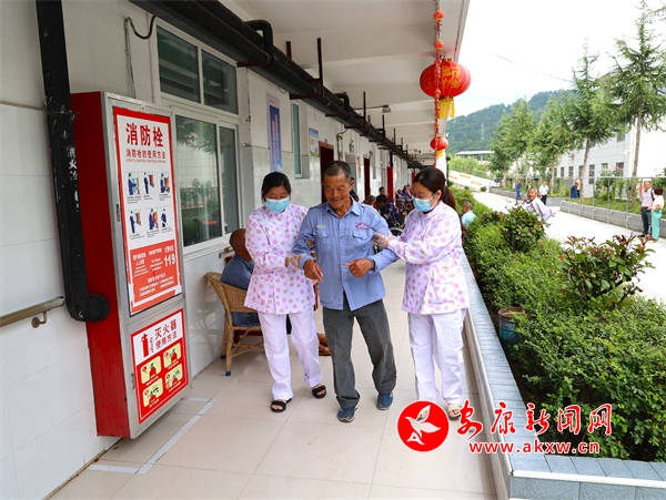 工作人員對行動(dòng)不便老人給予無微不至的照顧。