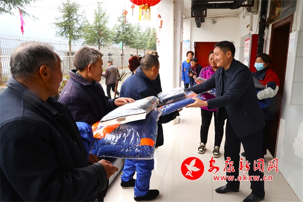 縣民政局局長柯玉俠向老人發(fā)放換季衣物。
