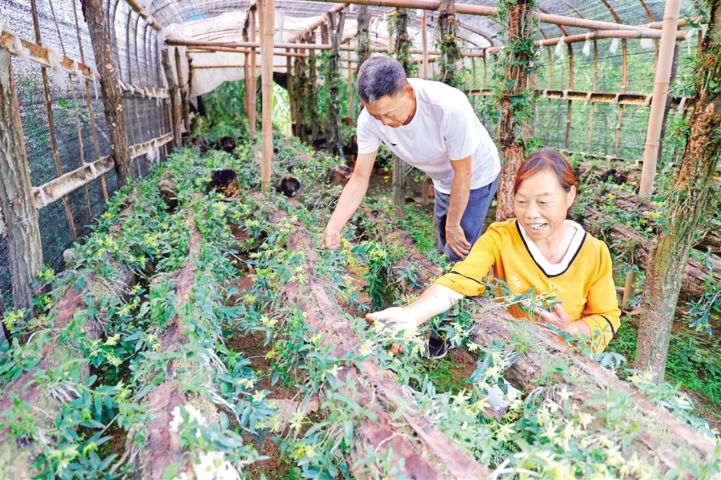 大道河鎮(zhèn)月池臺村四組胡德銀與妻子查看鐵皮石斛的生長情況。張?zhí)毂?攝