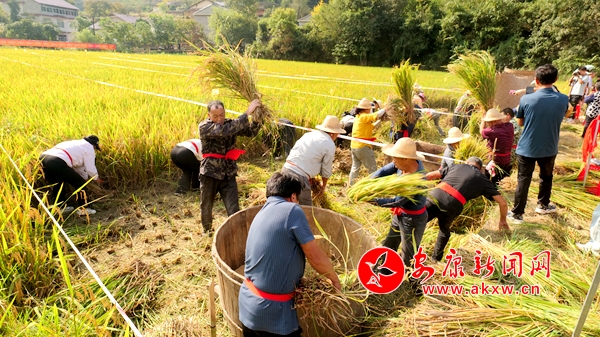 穗滿田頭谷滿倉(cāng),稻魚飄香慶豐年。稻田里,緊張激烈、歡快熱鬧的割稻、甩谷及釣魚比賽正在進(jìn)行,只見一株株水稻隨著鐮刀的刷刷聲倒下,一把把稻穗隨著摔打脫落為金色的谷粒,一條條稻魚在手中躍動(dòng),大家爭(zhēng)分奪秒、你追我趕,一派熱火朝天的景象。
