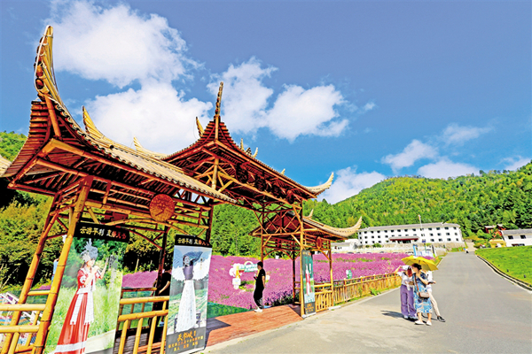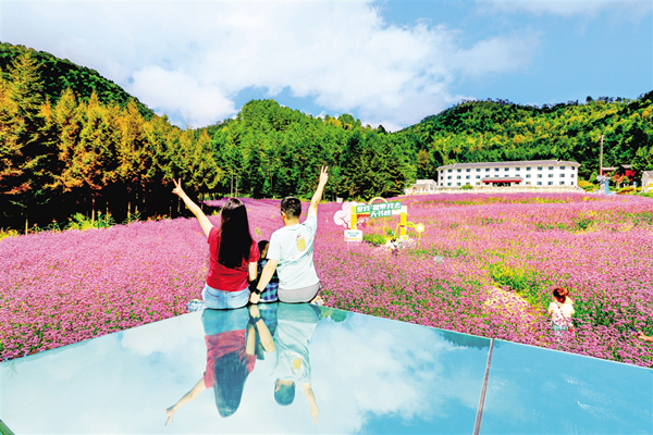 中秋節(jié)期間,平利千家坪森林公園天書峽馬鞭草花競(jìng)相怒放。如畫的景色吸引眾多游客前來賞景打卡。(詹永桂 攝)