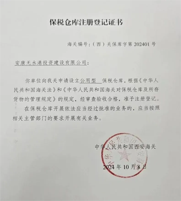 10月8日,由恒口示范區(qū)申請(qǐng)?jiān)O(shè)立的“公用型保稅倉(cāng)庫(kù)”正式通過(guò)海關(guān)審查驗(yàn)收,成功獲得由西安海關(guān)頒發(fā)的《保稅倉(cāng)庫(kù)注冊(cè)登記證書》,標(biāo)志著該保稅倉(cāng)已具備正式運(yùn)營(yíng)資質(zhì)和能力,可正式對(duì)外開(kāi)展實(shí)際業(yè)務(wù)。