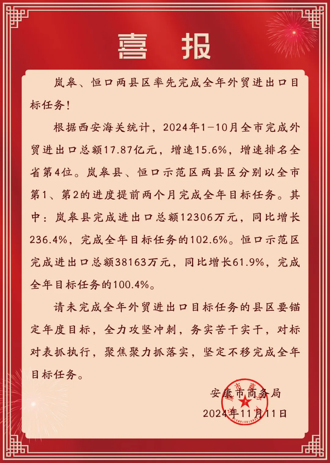?近日,市商務(wù)局發(fā)來喜報(bào),恒口示范區(qū)率先完成全年外貿(mào)進(jìn)出口目標(biāo)任務(wù)。