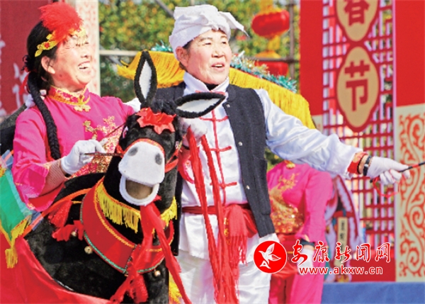 2月10日,民間藝人在金州廣場(chǎng)表演社火《毛驢迎新春》。趙華斌 攝