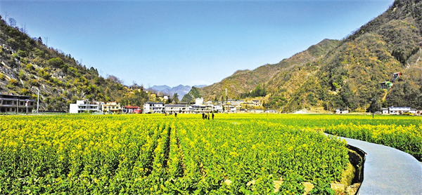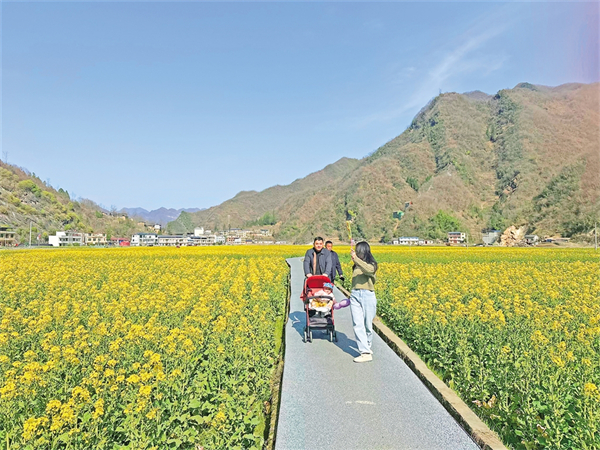 春暖花開,旬陽市仁河口鎮(zhèn)水泉坪千畝油菜花海競相綻放,慕名而來的游客們在觀光步道上觀光散步,三五伙伴一起拍照打卡、合唱民歌,欣賞高山出平川的獨特自然風光。