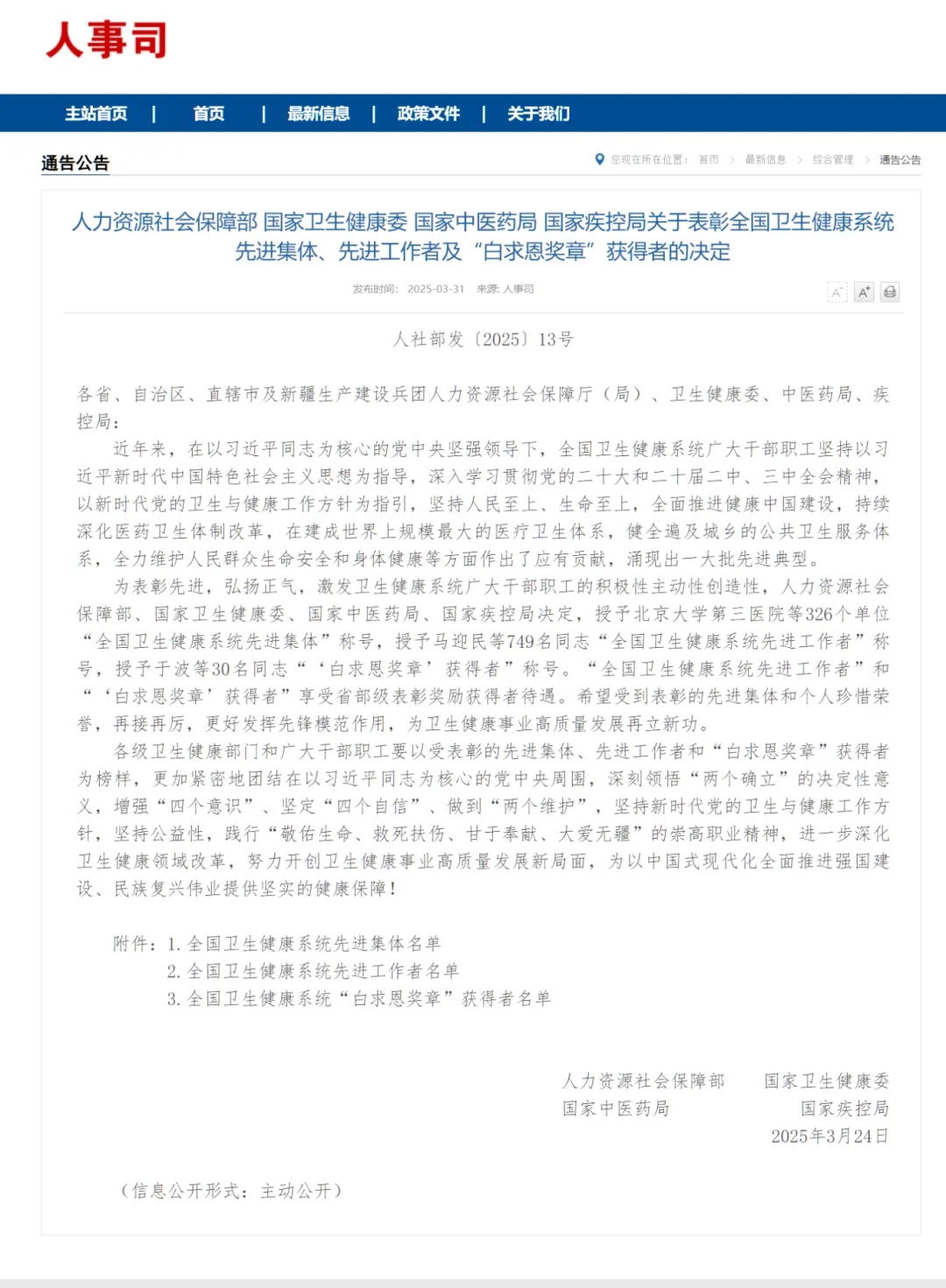 近日,人力資源社會保障部、 國家衛(wèi)生健康委等四部委發(fā)布關于表彰全國衛(wèi)生健康系統(tǒng)先進集體、先進工作者及“白求恩獎章”獲得者的決定,我市1個集體、1人分別獲得全國衛(wèi)生健康系統(tǒng)先進集體、全國衛(wèi)生健康系統(tǒng)先進工作者榮譽稱號。