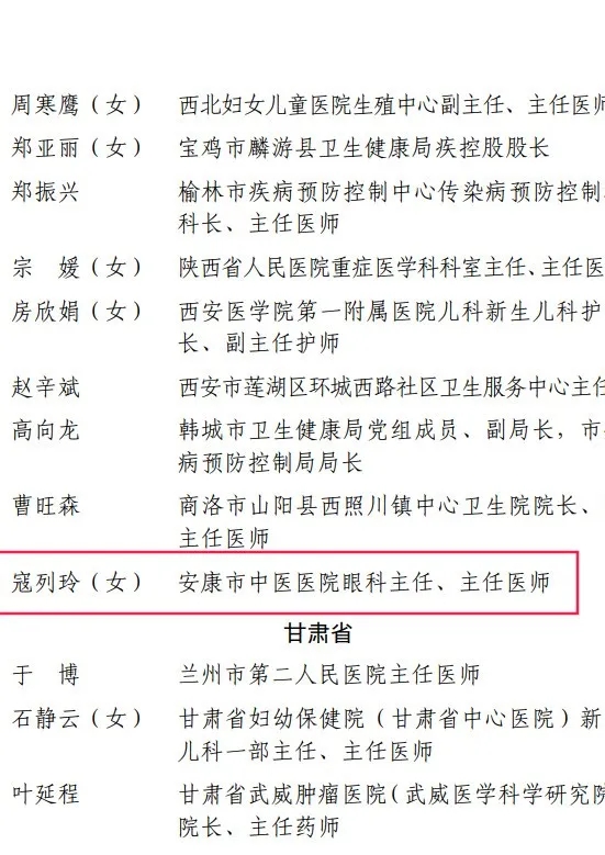 寇列玲,女,漢族,1975年10月生,陜西黃陵人,中共黨員,主任醫(yī)師,現(xiàn)任安康市中醫(yī)醫(yī)院眼科主任。該同志醫(yī)術精湛,服務患者耐心細致,心系社會,開展近視防控公益行進校園100余次,行程20萬公里,篩查學生10余萬人,受益學生50余萬人,解除安康山區(qū)數(shù)以萬計眼病患者痛苦,避免因盲致貧、因殘致貧。帶領眼科團隊銳意進取,眼科入選國家區(qū)域診療中心培育單位、國家中醫(yī)優(yōu)勢??平ㄔO項目、陜西省區(qū)域診療中心。參與國家中醫(yī)藥管理局《前部缺血性視神經(jīng)病變》臨床指南制修訂,完成省中醫(yī)藥管理局十大病種《玻璃體積血》《消渴目病》創(chuàng)新項目,取得陜西省科技成果三等獎2項,被評為安康市第四屆十佳醫(yī)生稱號,榮獲安康市十佳科技青年獎,被評為安康市有突出貢獻專家,入選“西部之光”訪問學者。