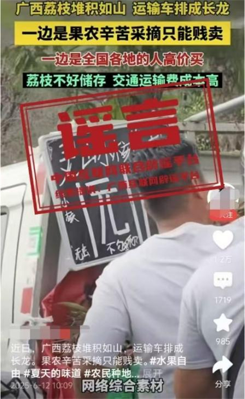 真相:6月12日,網(wǎng)傳“近日廣西荔枝堆積如山,運(yùn)輸車(chē)排成長(zhǎng)龍。果農(nóng)辛苦采摘只能賤賣(mài)”的視頻,畫(huà)面顯示荔枝堆積和“靈山荔枝1元”字樣。經(jīng)核查,視頻內(nèi)容并非發(fā)生在靈山縣。目前,靈山荔枝“妃子笑”等中熟品種逐漸批量上市,大規(guī)模上市時(shí)間為6月20日左右,當(dāng)前荔枝產(chǎn)銷(xiāo)有序開(kāi)展,并未發(fā)現(xiàn)個(gè)別媒體報(bào)道的“荔枝滯銷(xiāo)賤賣(mài)”“采摘堆積成山”“運(yùn)輸車(chē)排成長(zhǎng)龍”的情況,也沒(méi)有發(fā)現(xiàn)價(jià)格低到1元的荔枝出售。(來(lái)源:“廣西互聯(lián)網(wǎng)違法和不良信息舉報(bào)”微信公眾號(hào))