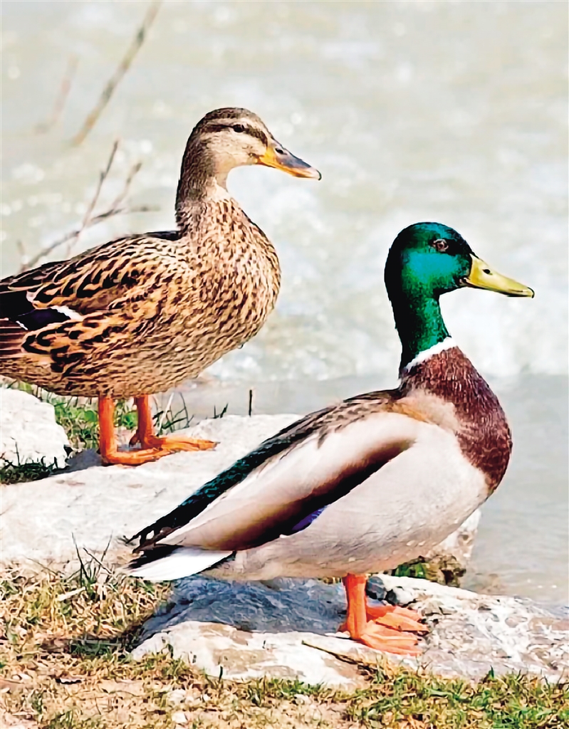 又名野鴨。雄鳥頭綠色,有一白色領環(huán),胸栗色,翼鏡藍綠色,尾上、下覆羽黑色,嘴黃綠色,腳橙紅色;雌鳥嘴橙黃色,貫眼紋黑褐色,全體褐色,有暗褐色斑紋。(來源:安康市林學會)