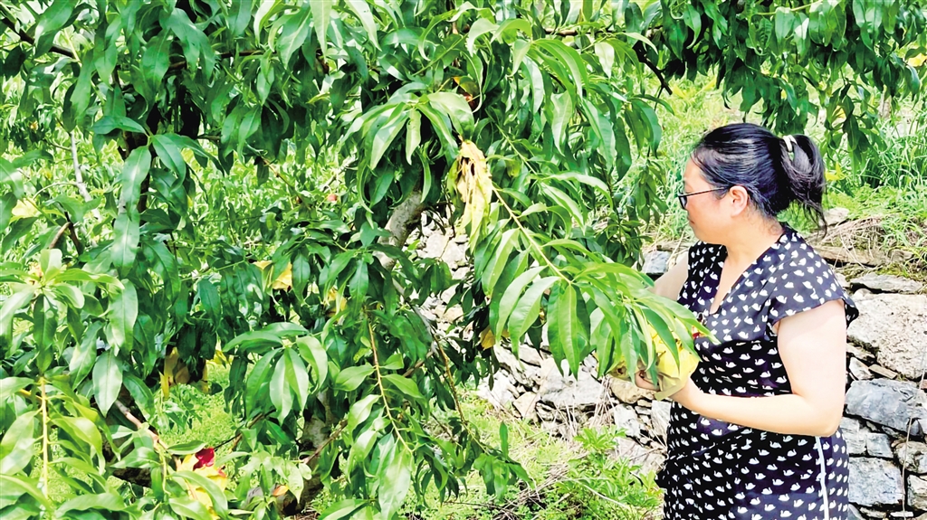 穿過村莊,山坡上500畝桃園綠意盎然?;刎撠?zé)人伍娟與工人正采摘套袋?!?017年建設(shè)的桃園,今年雖受旱情影響,產(chǎn)量仍達30萬斤,產(chǎn)值約300萬元?!?o:p>