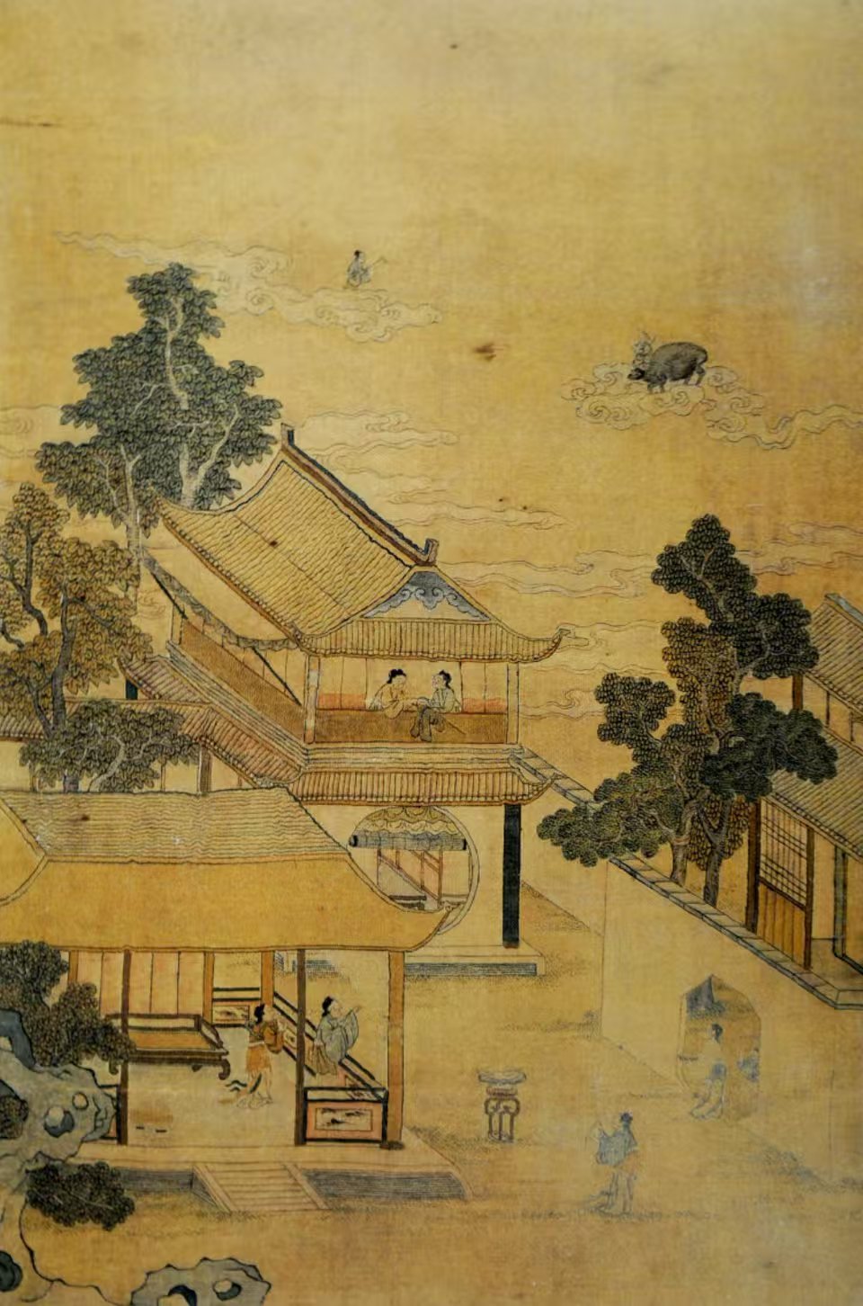 北京故宮博物院收藏的清代緙絲七夕乞巧圖軸,將天上和人間完美融合:上半部分是天上,牛郎織女在祥云圍繞下相會,眼神中充滿了深情和眷戀;下半部分是人間,幾位婦女或憑欄遠(yuǎn)眺,或?qū)掌蚯?,一派和諧景象。這幅圖軸以緙絲工藝展現(xiàn),色彩豐富、線條細(xì)膩,不僅展現(xiàn)了古人高超的技藝,也反映了當(dāng)時社會對七夕節(jié)的重視和人民對美好生活的向往。
