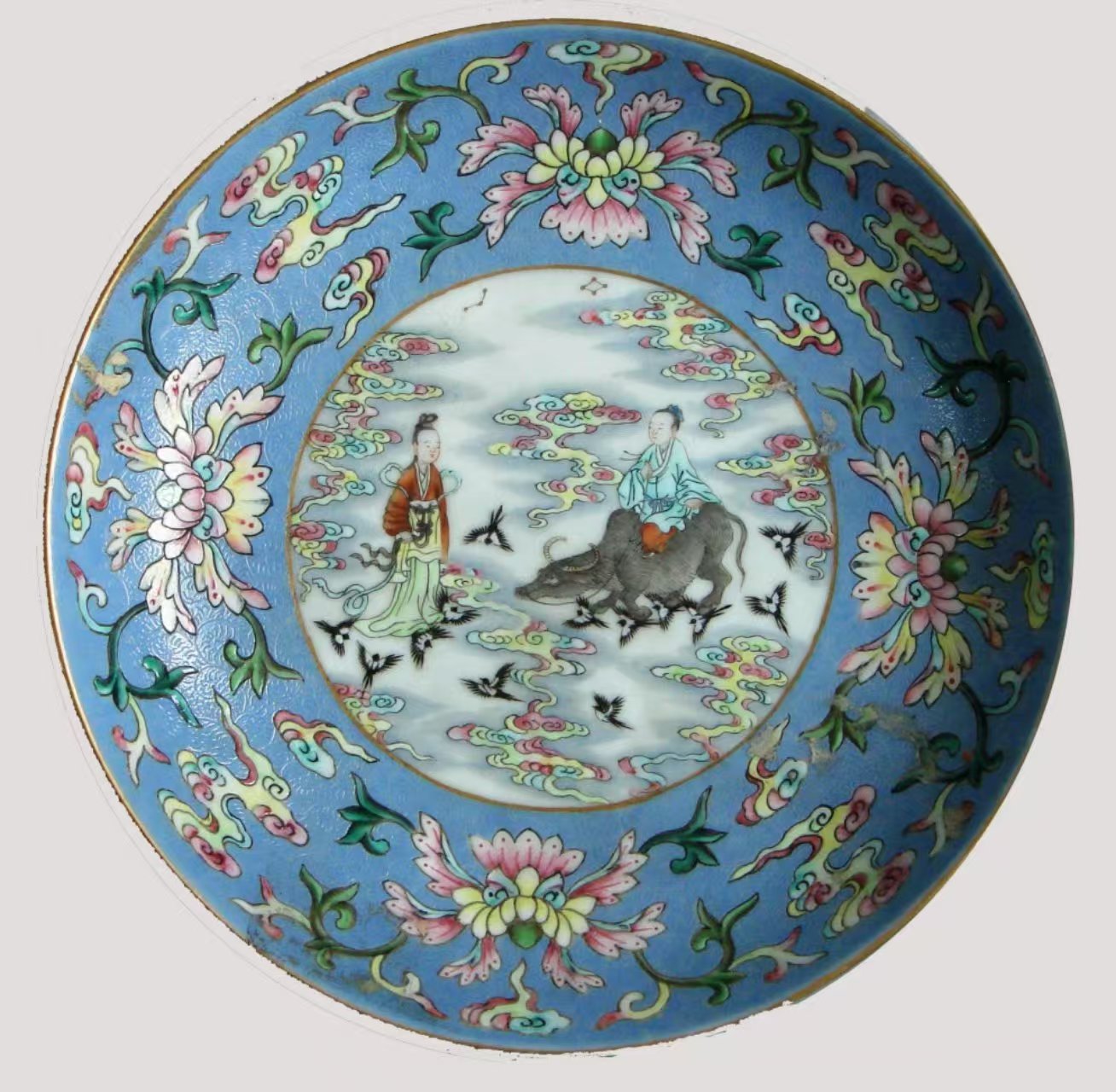 北京藝術(shù)博物館收藏的清代景德鎮(zhèn)官窯粉彩人物圖盤,就像一幅流動的七夕畫卷。此盤工藝精湛,口沿涂金,熠熠生輝,盡顯皇家氣派。盤內(nèi)外壁采用“粉彩軋道”工藝,天藍(lán)釉地上淺淺的卷草紋似微風(fēng)輕拂,粉彩花卉與朵云紋相互映襯,如夢如幻。盤內(nèi)底描金圓形開光處,粉彩繪就的人物故事圖案更為生動:牛郎坐于牛背,手握韁繩,深情凝望;織女身姿婀娜,嬌羞回望,二人似在互訴衷腸。背景中祥云繚繞、星辰閃爍、鵲鳥紛飛,為這場相會營造了浪漫的氛圍。外底“鵲橋仙渡”四字,點(diǎn)明主題。