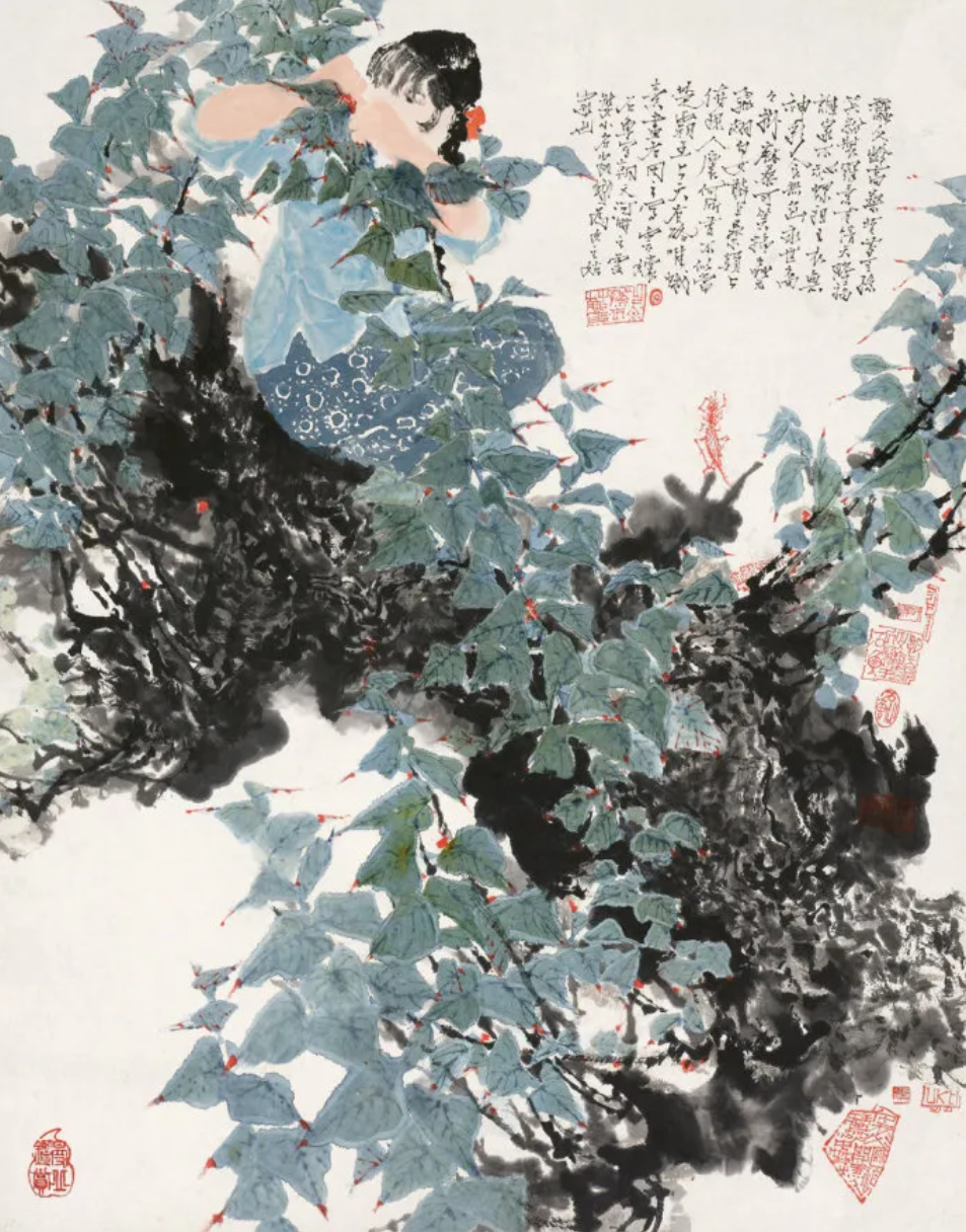 題識(shí):蠶女齡喬桑,昔有王孫笑粉妝。羅素有情天降福,誰(shuí)家不秘王祖。衣無(wú)神采食無(wú)魚(yú),永世商裔掛麻桑。可笑棉蟲(chóng)無(wú)飛翅,白女敢上桑顛上。俯視人寰何所有,不似當(dāng)(年)楚霸王。上天有路唯蛾素,畫(huà)者因之寫(xiě)云。石魯寫(xiě)朝天河畔之云婆,小名安蛾,為女之姑家也。《采桑圖》,2010春拍成交價(jià)1064萬(wàn)元。