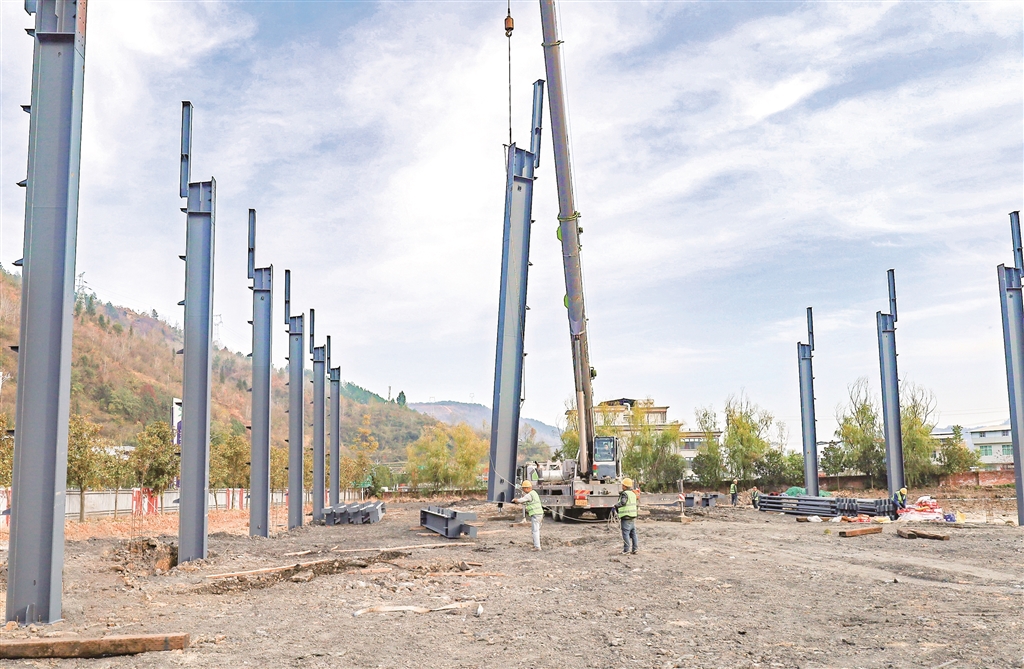 11月26日,紫陽(yáng)高新區(qū)冷鏈倉(cāng)儲(chǔ)物流園項(xiàng)目第一批鋼構(gòu)材料進(jìn)場(chǎng),工人們正在開展吊裝作業(yè)。 肖昌尉 攝