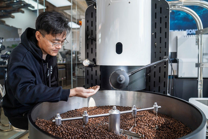 ? ? ? ? ? ? ? ? ? ? ? ? ? ? 2025年12月10日,韓君瑋在位于昆明的南來(lái)盛咖啡店內(nèi)烘焙咖啡豆。
