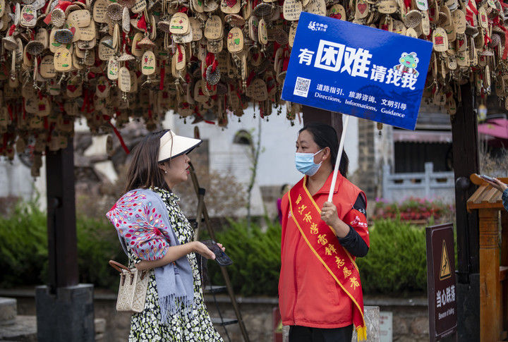 2023年5月18日,一名游客(左)在麗江古城向志愿者咨詢。2015年12月,云南麗江古城保護(hù)管理局牽頭成立了麗江古城旅游志愿者服務(wù)隊(duì),志愿者主要來(lái)自市區(qū)機(jī)關(guān)單位、古城保護(hù)管理局、古城經(jīng)營(yíng)戶、在校學(xué)生、社區(qū)居民等,常年在古城內(nèi)提供旅游咨詢、道路指引、文明引導(dǎo)等志愿服務(wù)。