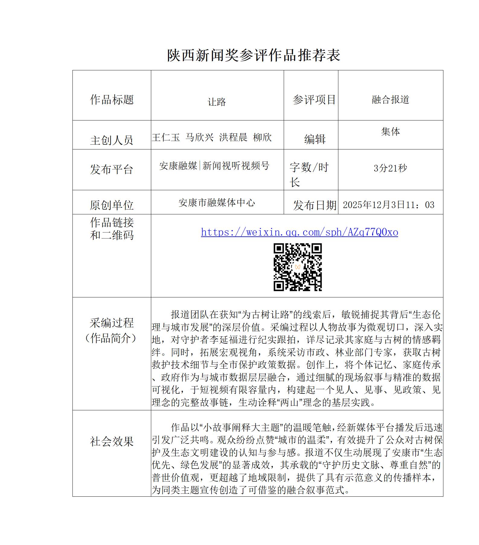 根據(jù)《陜西新聞獎(jiǎng)、陜西省優(yōu)秀新聞工作者評(píng)選辦法》和《關(guān)于開(kāi)展2025年度陜西新聞獎(jiǎng)融合報(bào)道、應(yīng)用創(chuàng)新和新媒體新聞專(zhuān)欄作品推優(yōu)工作的通知》要求,經(jīng)個(gè)人申報(bào)、部門(mén)推薦和中心編委會(huì)嚴(yán)格篩選,對(duì)以下3件2025年度陜西新聞獎(jiǎng)融合報(bào)道、應(yīng)用創(chuàng)新、新媒體新聞專(zhuān)欄參評(píng)作品進(jìn)行公示。(作品推薦表附后)