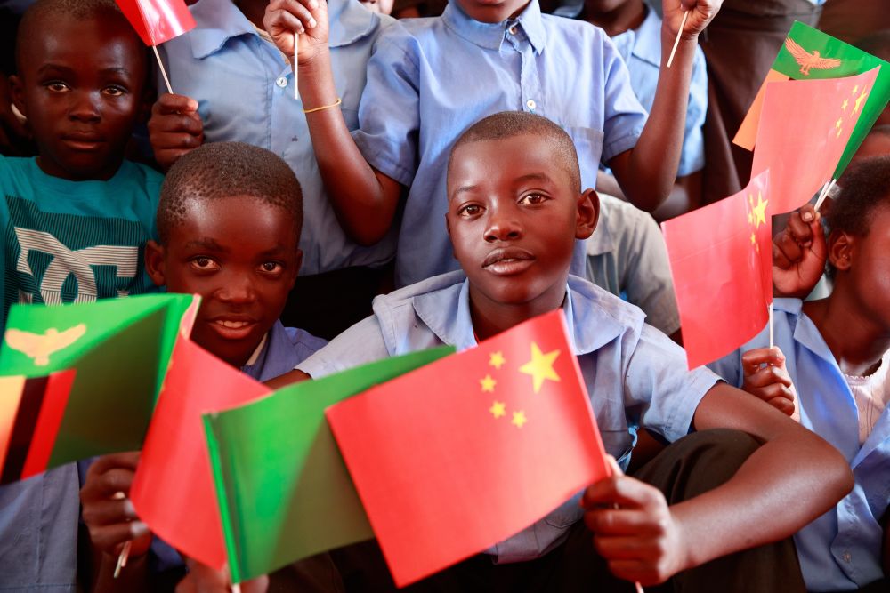 這是2019年6月13日,在贊比亞盧薩卡省瓊圭區(qū),手持中贊兩國國旗的兒童參加中國援非“萬村通”贊比亞項(xiàng)目竣工儀式。新華社記者 彭立軍 攝