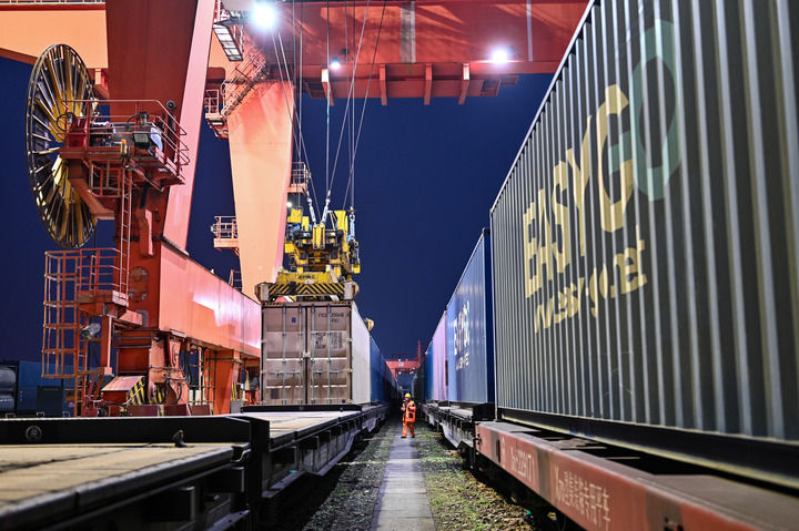 貨運(yùn)員在成都國(guó)際鐵路港檢查吊運(yùn)的中歐班列集裝箱(2026年2月16日攝)。新華社發(fā)(何海洋 攝)