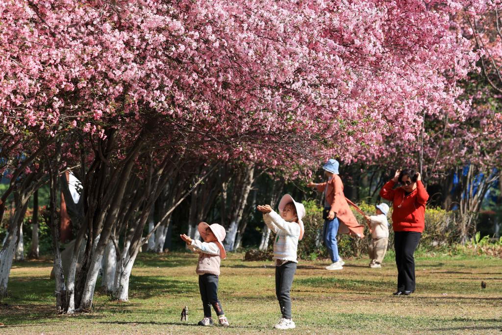 近日,游客在云南省曲靖市沾益區(qū)玉林廣場(chǎng)海棠花樹(shù)下賞景游玩。新華社發(fā)(孫文來(lái)攝)
