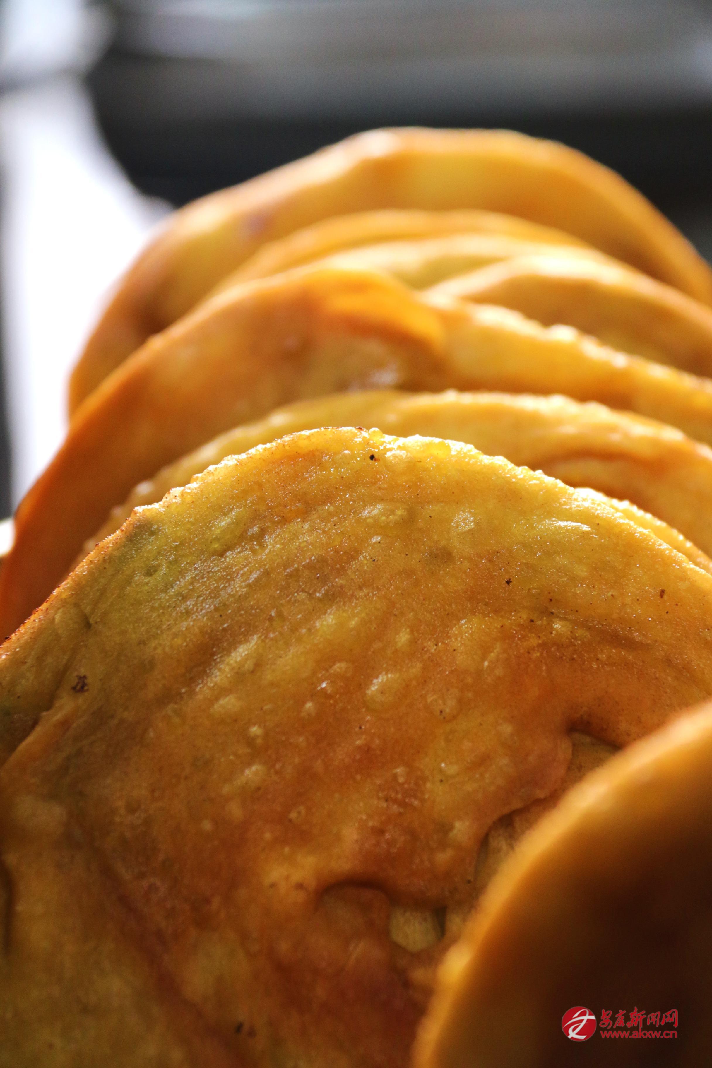 煎餅要用平底鍋,油要多,最好能沒(méi)過(guò)餅的一半。鍋燒熱了,放一點(diǎn)煉過(guò)的羊油,那油在鍋底滋滋地化開(kāi),香氣就起來(lái)了。餅放下去,小火慢煎,不住地翻面。眼看著,餅子慢慢鼓起來(lái),皮兒漸漸金黃,有些地方焦黃了,有些地方還嫩著。起鍋的時(shí)候,整個(gè)餅子金黃黃的,油光光的,拿在手里燙得很。