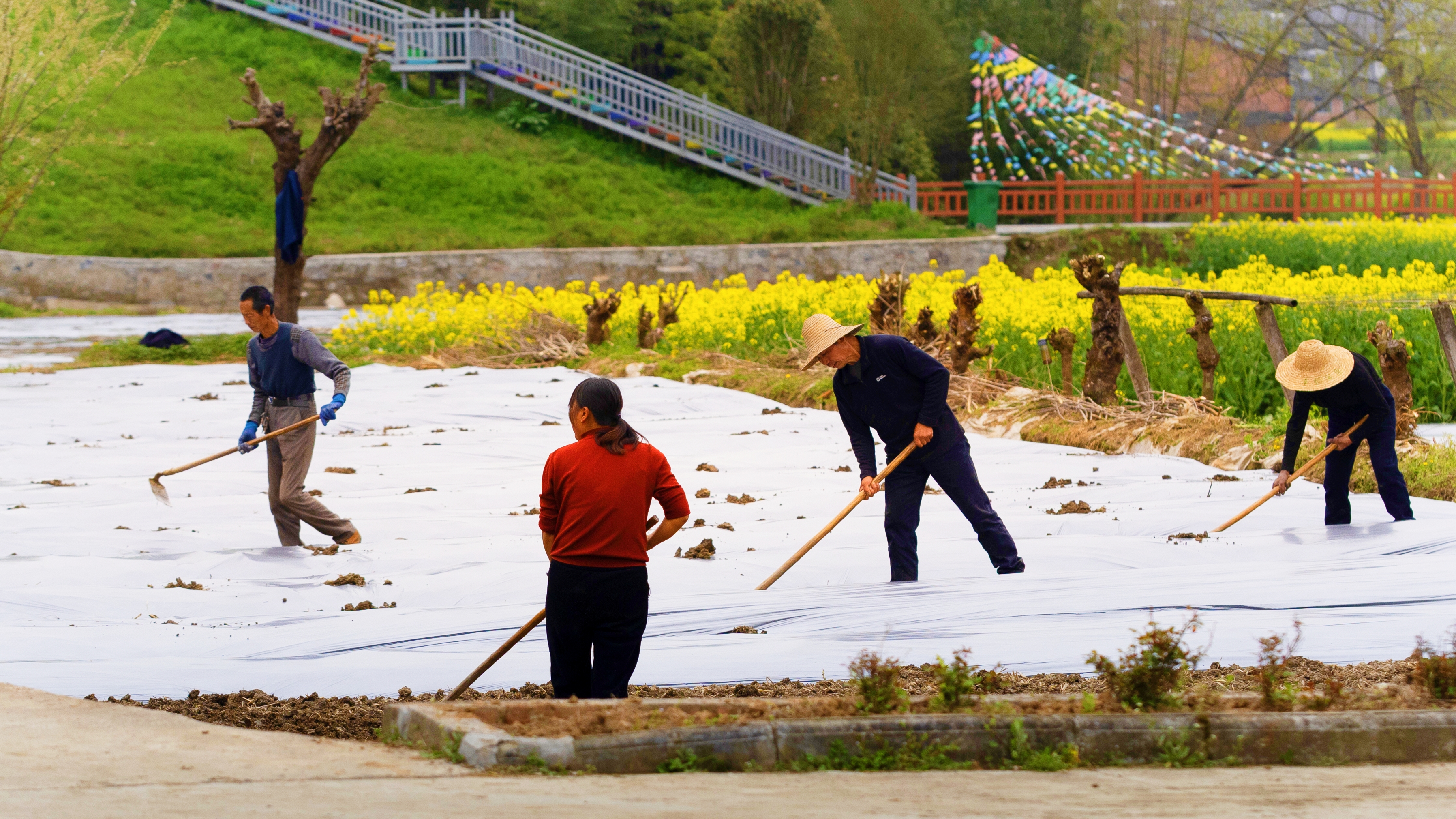 花海之上風(fēng)光旖旎,花海之下農(nóng)事正忙。趁著晴好天氣,當(dāng)?shù)剞r(nóng)戶搶抓春耕有利時(shí)節(jié),田間地頭一派熱火朝天的忙碌景象。大家分工協(xié)作、有條不紊,忙著起壟整地、鋪設(shè)地膜,為紫長茄子移栽做前期準(zhǔn)備工作。