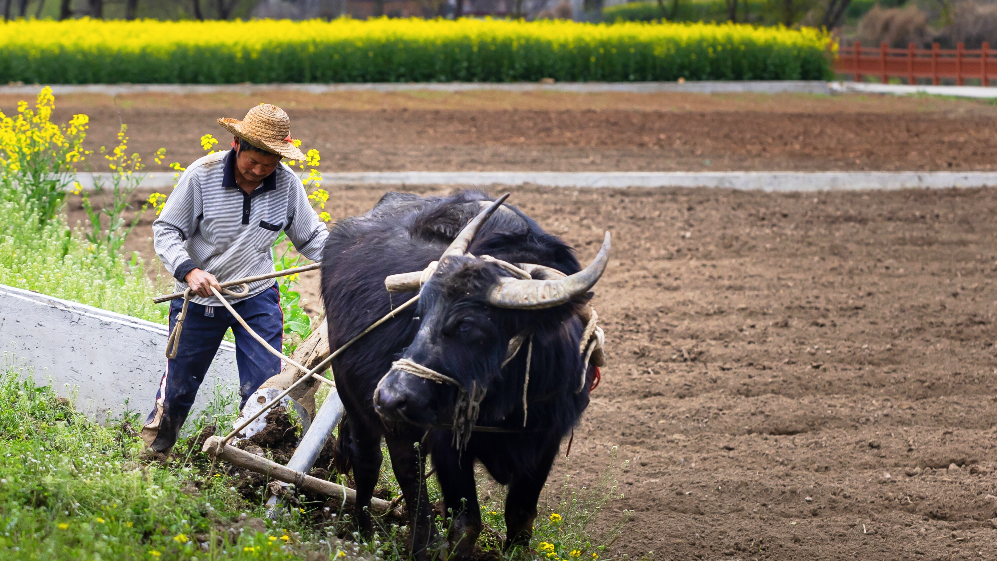 花海春耕兩相映