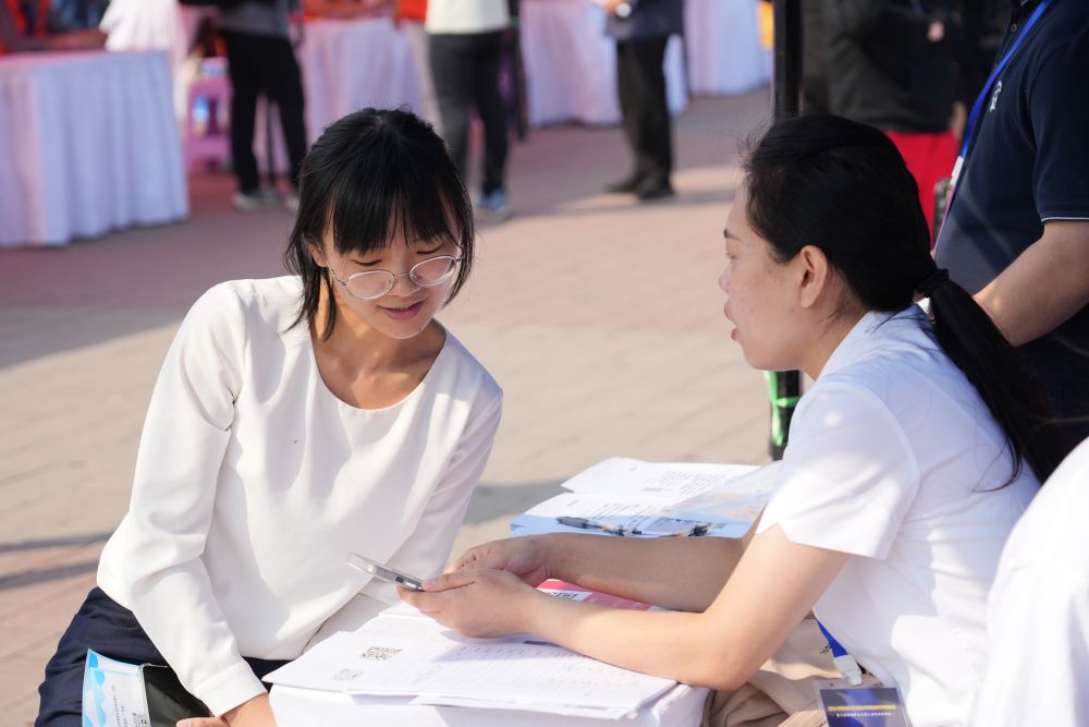 2024年9月25日,求職者(左)在招聘會現(xiàn)場與招聘單位工作人員交流。當(dāng)日,雄安新區(qū)舉辦2024年河北省畢業(yè)生就業(yè)市場雄安新區(qū)專場招聘會暨河北雄安新區(qū)大型人力資源招聘會。招聘會以“穩(wěn)崗就業(yè) 聚才發(fā)展”為主題,邀請京津冀地區(qū)共157家企業(yè)線下參會,提供就業(yè)崗位4783個(gè)。