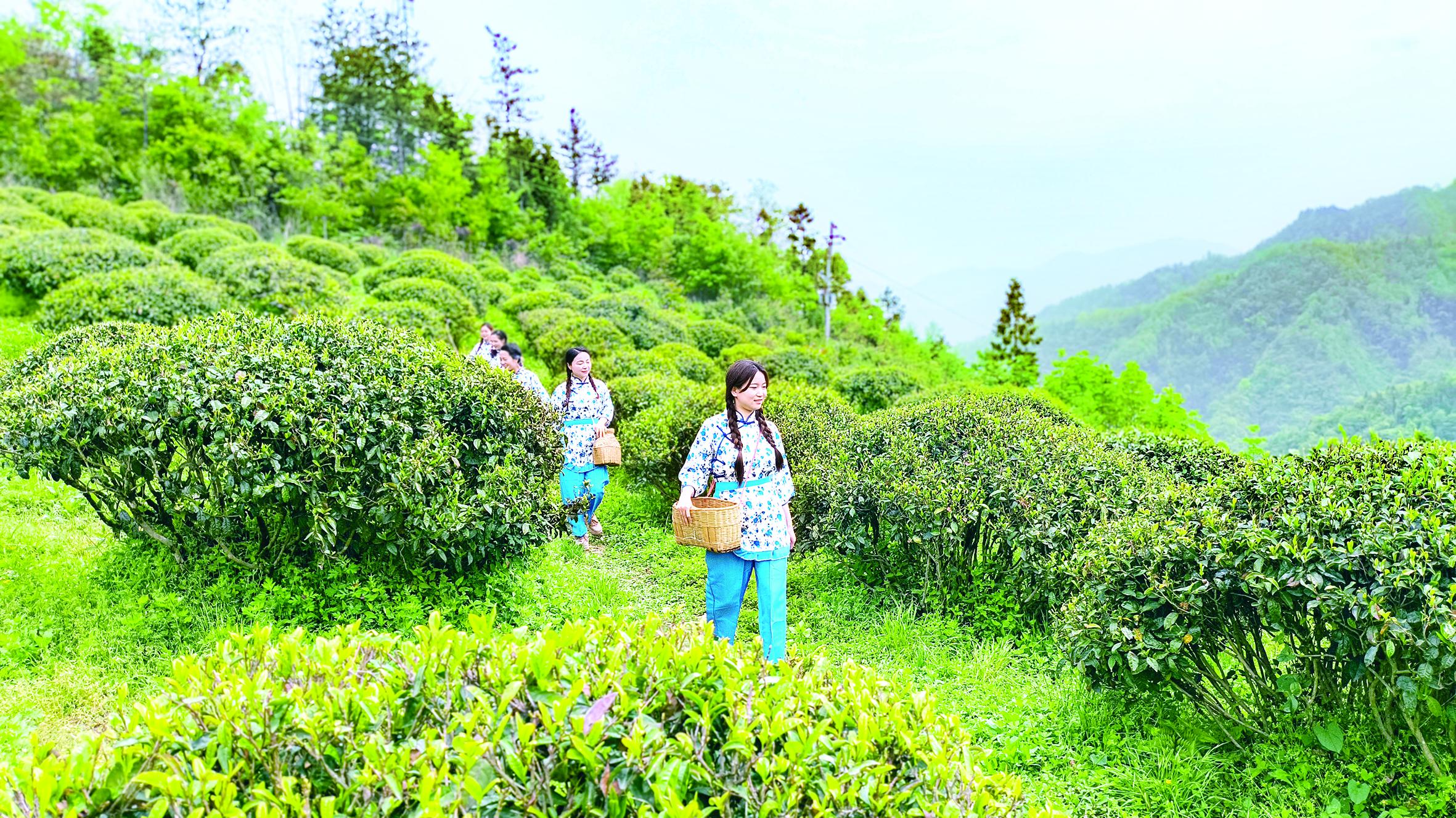 4月7日,紫陽(yáng)縣雙橋鎮(zhèn)村民走進(jìn)蓮花村的高山古樹茶園,采摘茶鮮葉。儲(chǔ)茂銀 攝