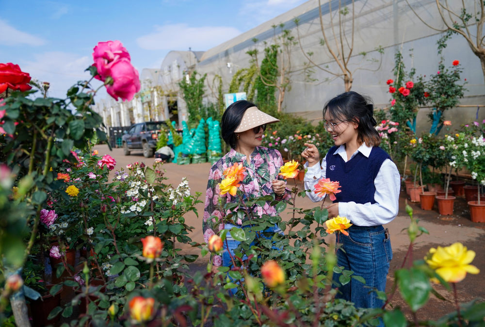2025年4月11日,越南花商阮翠云(左)與翻譯李青歌在云南昆明斗南一花卉基地內查看鮮花品質。2018年,阮翠云開始在越南銷售云南花卉,讓七彩“云花”成為眾多越南家庭的“??汀?。借助高效的電商平臺和快捷的物流網(wǎng)絡,鮮花從云南花田到河內貨架實現(xiàn)了“次日達”。